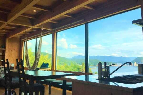 “Hiuchi” được xây dựng bằng phương pháp xây dựng từ vật liệu gỗ có tên “Aero House”, một mặt tường là cửa sổ, không gian toàn cảnh với biển và núi trải rộng. Các bạn có thể nhìn thấy chiếc võng được treo trong không gian thoáng đãng này.