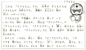 ドラえもん これは 「ドラえもん」です。 日本の 子どもたちは ドラえもんが 大好きです。漫画の 主人公で、猫の 形の ロボットです。 ドラえもんは 不思議な ポケットを 持って いて、いろいろな 物が 出せます。例えば、「タケコプター」や「タイムテレビ」です。「タケコプター」を 頭に 付けると、自由に 空を 飛べます。「タイムテレビ」では 昔の 自分や 将来の 自分が 見られます。 わたしが いちばん 欲しい 物は 「どこでもドア」です。この ドアを 開けると、どこでも 行きたい 所へ 行けます。皆さん、もし ドラえもんに 会えたら、どんな 物を 出して もらいたいですか。 |