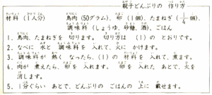親子どんぶりの 作り方 材料(1人分) 鳥肉(50グラム)、卵(1個)、たまねぎ(1/4個)、調味料(しょうゆ、砂糖、酒)、ごはん 1.鳥肉、たまねぎを 切ります。切り方は (1)の とおりです。 2.なべに 水と 調味料を 入れて、火に かけます。 3.調味料が 熱く なったら、(1)の 材料を 入れて、煮ます。 4.肉が 煮えたら、卵を 入れます。 卵を 入れた あとで、火を 消します。 5.1分ぐらい あとで、どんぶりの ごはんの 上に 載せます。 |