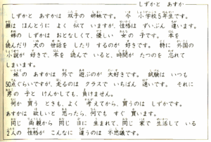 しずかと あすか しずかと あすかは 双子の 姉妹です。今 小学校5年生です。顔は ほんとうに よく 似て いますが、性格は ずいぶん 違います。 姉の しずかは おとなしく、優しい 女の 子です。本を 読んだり 犬の 世話を したり するのが 好きです。特に 外国の 小説が 好きで、本を 読んで いると、時間が たつのを 忘れて しまいます。 妹の あすかは 外で 遊ぶのが 大好きです。試験は いつも 50点ぐらいですが、走るのは クラスで いちばん 速いです。それに 男の 子と けんかしても、負けません。 何か 買う ときも、よく 考えてから、買うのは しずかです。あすかは 欲しいと 思ったら、何でも すぐ 買います。 同じ 両親から 同じ 日に 生まれて、同じ 家で 生活して いる 2人の 性格が こんなに 違うのは 不思議です。 |