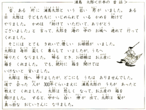 浦島 太郎<日本の 昔話> 昔、ある 所に 浦島 太郎と いう 若い 男が いました。ある 日 太郎は 子どもたちに いじめられて いる かめを 助けて やりました。かめは 「助けて いただいて、ありがとう ございました」と 言って、太郎を 海の 中のお城へ 連れて 行って くれました。 そこには とても きれいで、優しい お姫様が いました。太郎は 毎日 楽しく 暮らして いましたが、うちへ 帰りたく なりました。帰る とき、お姫様は お土産に 箱を くれました。でも、絶対に 箱を 開けては いけないと 言いました。 太郎は 陸へ 帰りましたが、どこにも うちは ありませんでした。道で 会った 人が 300年ぐらいまえに 浦島太郎の うちが あったと 教えて くれました。太郎は 悲しく なって、お土産の 箱を 開けました。すると、中から 白い 煙が 出て、太郎は 髪が 真っ白な おじいさんに なりました。 |