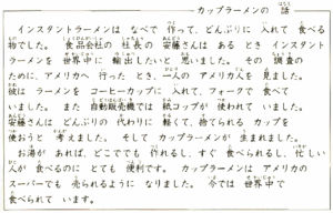 カップラーメンの 話 インスタントラーメンは なべで 作って、どんぶりに 入れて 食べる ものでした。食品会社の 社長の 安藤さんは ある とき インスタントラーメンを 世界中に 輸出したいと 思いました。その 調査の ために、アメリカへ 行った とき、一人の アメリカ人を 見ました。彼は ラーメンを コーヒーカップに 入れて、フォークで 食べて いました。また 自動販売機では 紙コップが 使われて いました。 安藤さんは どんぶりの 代わりに 軽くて、捨てられる カップを 使おうと 考えました。そして、カップラーメンが 生まれました。 お湯が あれば、どこででも 作れるし、すぐ 食べられるし、忙しい 人が 食べるのに とても 便利です。カップラーメンは アメリカの スーパーでも 売られるように なりました。今では 世界中で 食べられて います。 |