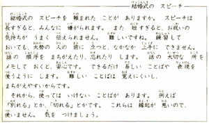 結婚式の スピーチ 結婚式の スピーチを 頼まれた ことが ありますか。スピーチは 長すぎると、みんなに 嫌がられます。また 短すぎると、お祝いの 気持ちが うまく 伝えられません。難しいですね。練習して おいても、大勢の 人の 前に 立つと、なかなか 上手に できません。話の 順序を まちがえたり、忘れたり します。話の 大切な 所を メモして おくと、安心です。できるだけ 易しい ことばや 表現を 使う ように します。難しい ことばは 覚えにくいし、まちがえやすいからです。 それから、使っては いけない ことばが あります。例えば、「別れる」とか、「切れる」とかです。これらは 縁起が 悪いので、使いません。気を つけましょう。 |