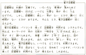 電子図書館 図書館は 知識の 宝庫です。いろいろな 情報が 集められて います。図書館へ 行けば、いつでも 必要な 本が 手に 入る はずです。しかし、図書館に 欲しい 本が ない ときや、調べに 行く 時間が ない ときが あります。そんな とき、電子図書館が 役に 立ちます。 電子図書館は パソコンを 使って 図書館を 利用する システムです。例えば、キーワードや 本の 名前の 一部分を 入力すれば、欲しい 本が すぐ 調べられます。辞書 1冊が 2秒で 出せるし、図や 写真も 簡単に 見られます。出た ばかりの 新しい 本も すぐ 見られます。電子図書館なら、いつでも どこででも、利用できます。 最近 人は 本を 読まなく なったと 言われて いますが、パソコンを 使って 図書館を利用する 人が 増えるかも しれません。 |