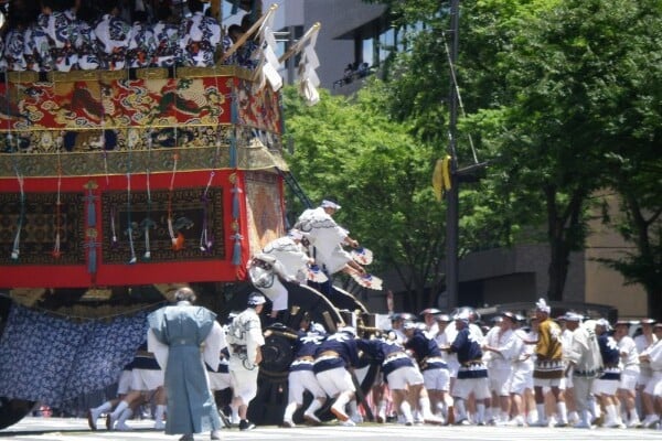 Yamaboko được kéo bởi 40 ~ 50 người. "Tsujimawashi" (trong ảnh) xoay Yamaboko theo hướng vuông góc chỉ bằng sức người, các bạn đừng bỏ lỡ nhé.